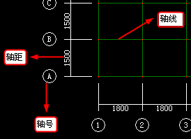 组成轴网的线段叫【轴线】,【轴线】用【轴号】命名,【轴线】间的距离叫【轴距】,如右图所示。点击轴距与轴号可对其进行编辑。